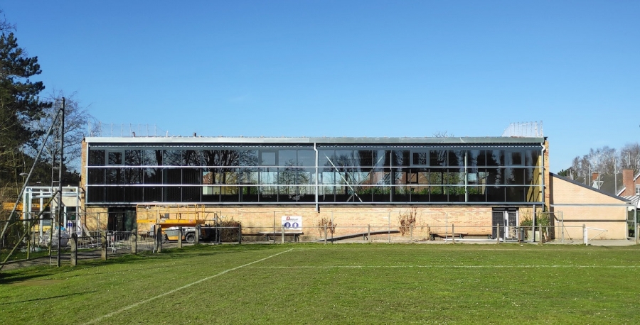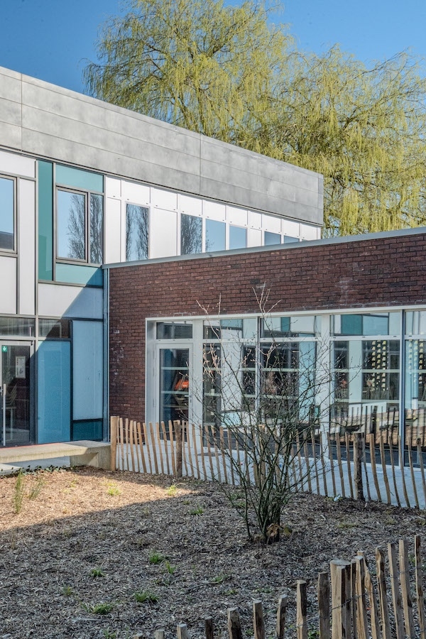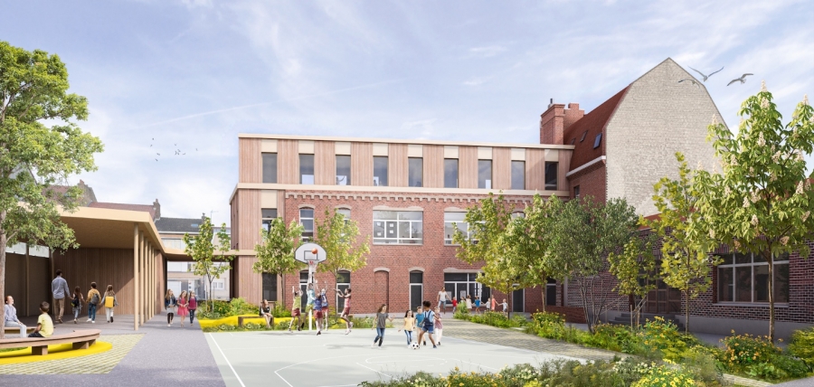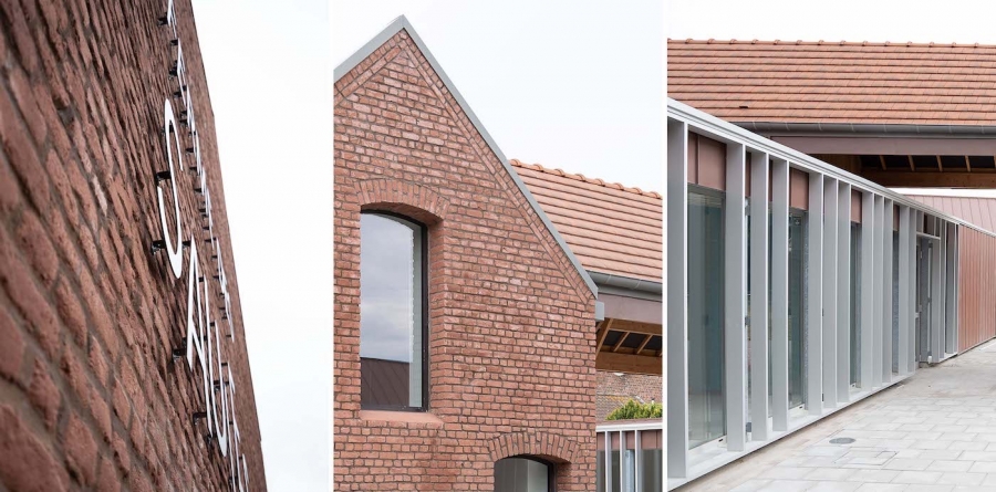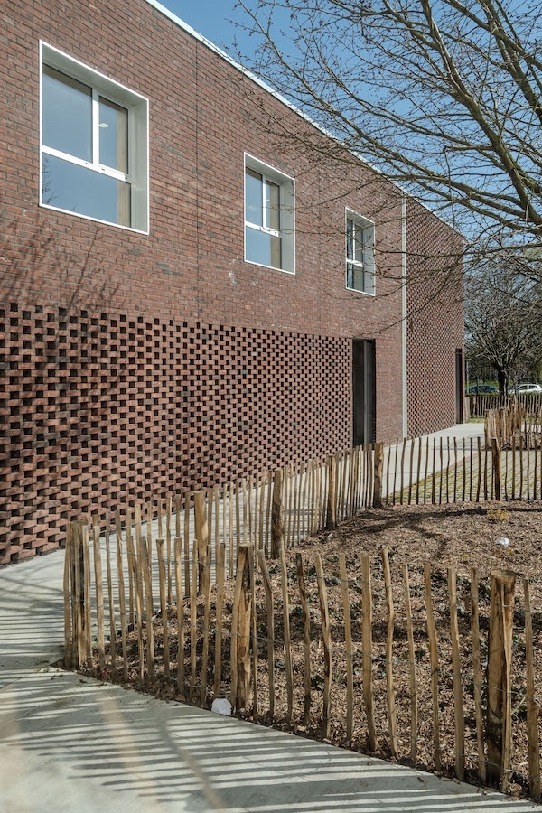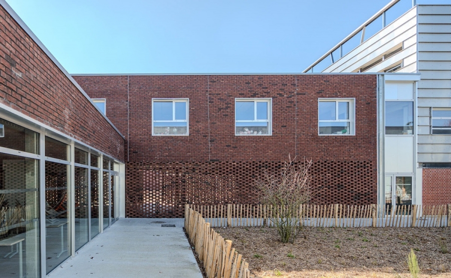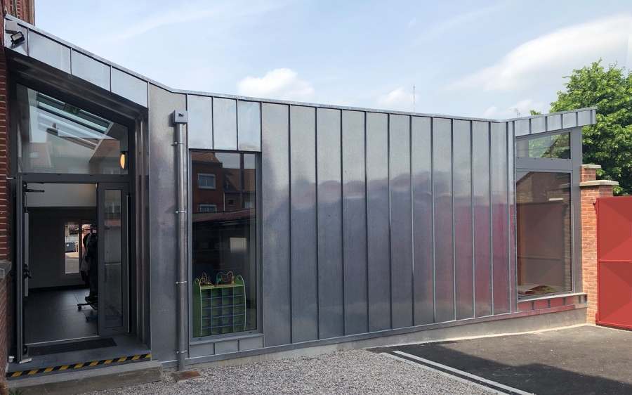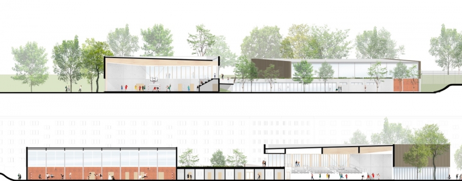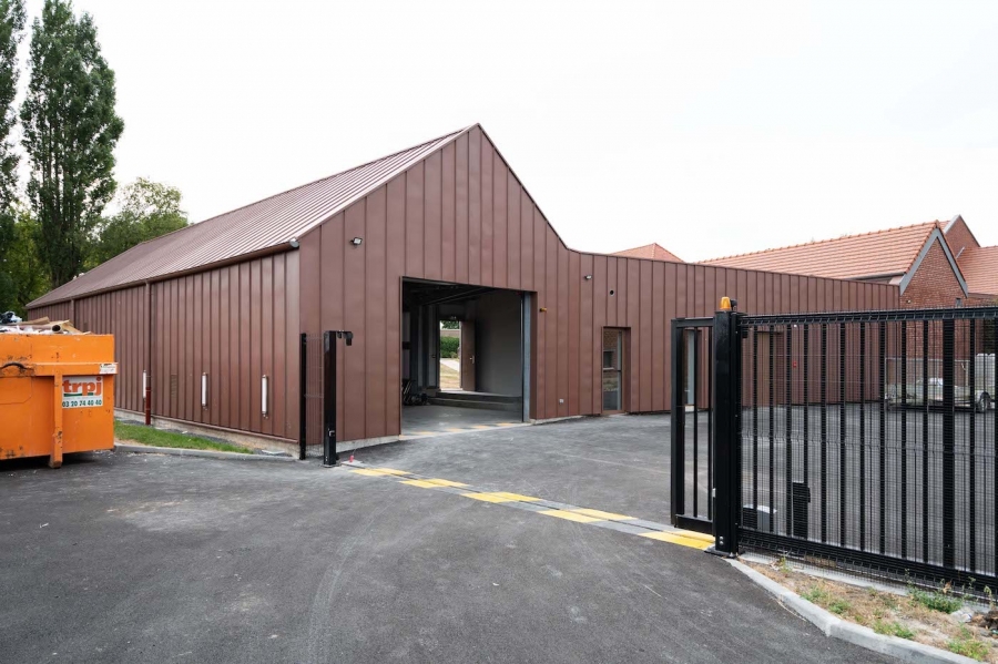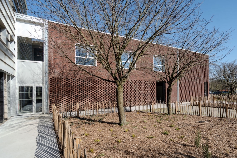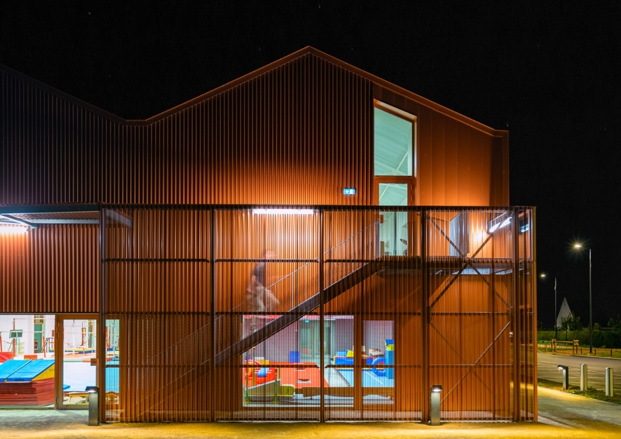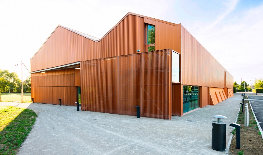 L’enveloppe du complexe sportif est isolée par l’extérieur sur l’extension et les vestiaires et par l’intérieur lorsque la brique existante veut être gardée apparente, à l’image du pignon principal. La salle René Werquin fait ainsi « peau neuve » en se parant d’un revêtement de façade en acier de couleur rose cuivré, une teinte complémentaire aux nuances de jaune de la brique existante. Le bardage de l’extension, celui de l’ITE des vestiaires et les brise-soleil de la salle se déclineront en tôle acier parfois pleine, parfois perforée, jouant avec les rythmes des pliages pour animer les façades du complexe sportif.