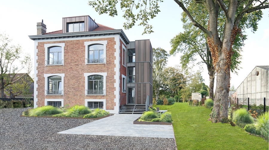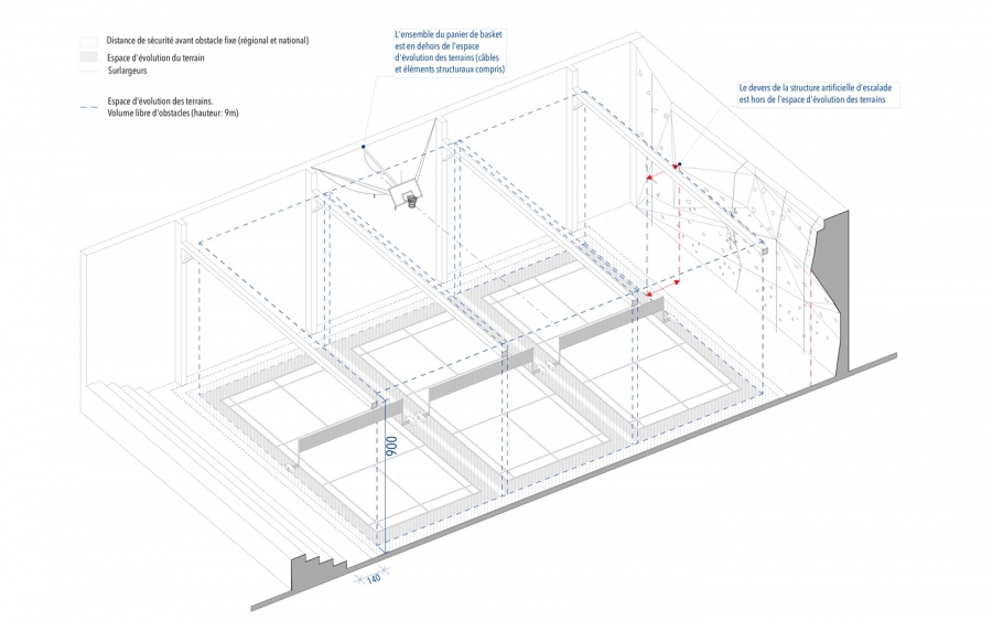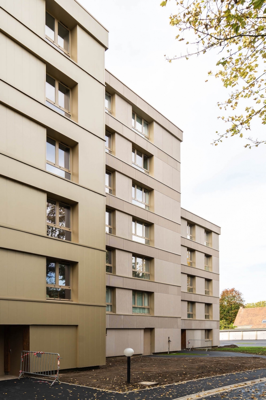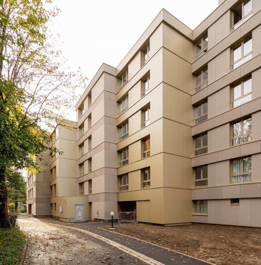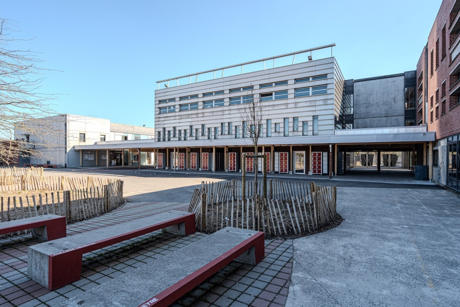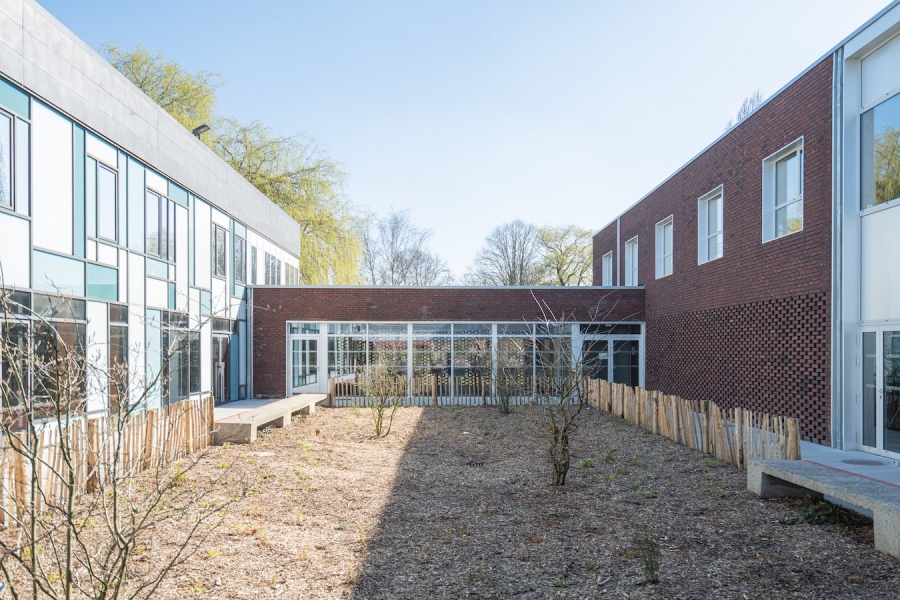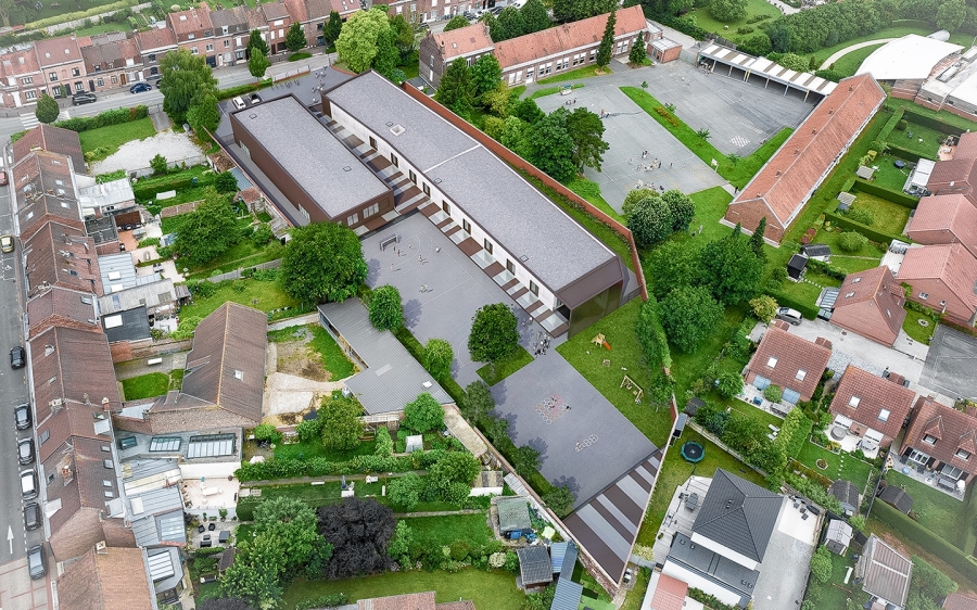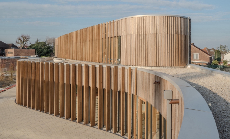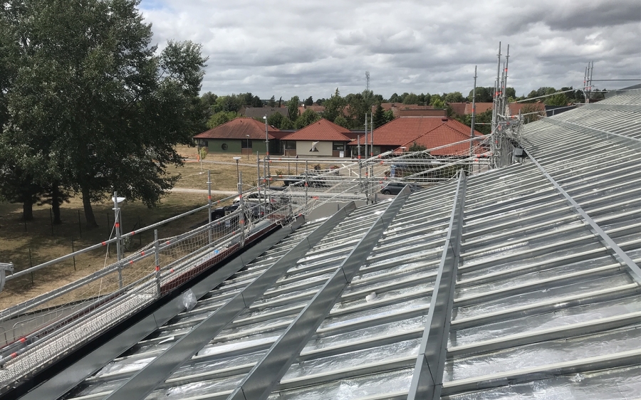 L’enveloppe du complexe sportif est isolée par l’extérieur sur l’extension et les vestiaires et par l’intérieur lorsque la brique existante veut être gardée apparente, à l’image du pignon principal. La salle René Werquin fait ainsi « peau neuve » en se parant d’un revêtement de façade en acier de couleur rose cuivré, une teinte complémentaire aux nuances de jaune de la brique existante. Le bardage de l’extension, celui de l’ITE des vestiaires et les brise-soleil de la salle se déclineront en tôle acier parfois pleine, parfois perforée, jouant avec les rythmes des pliages pour animer les façades du complexe sportif.