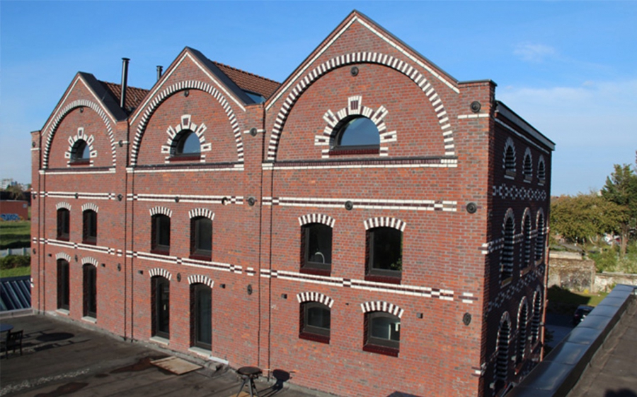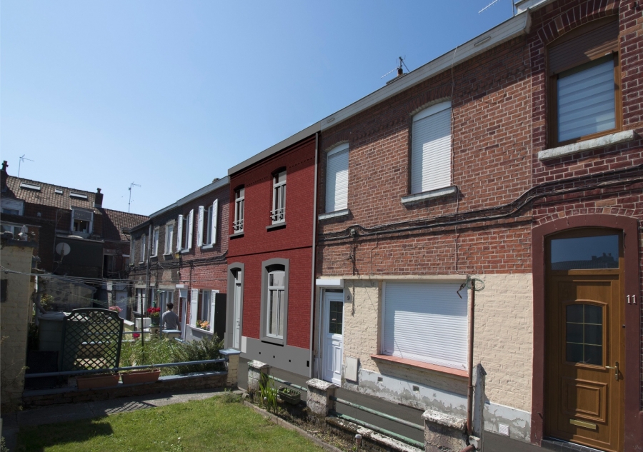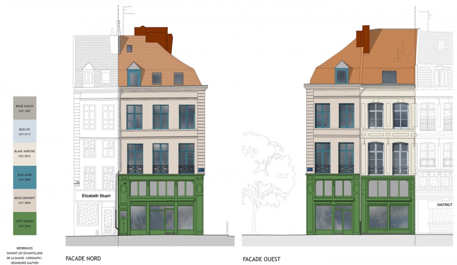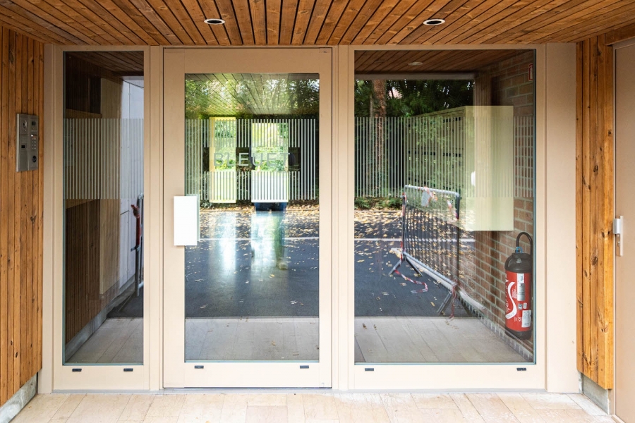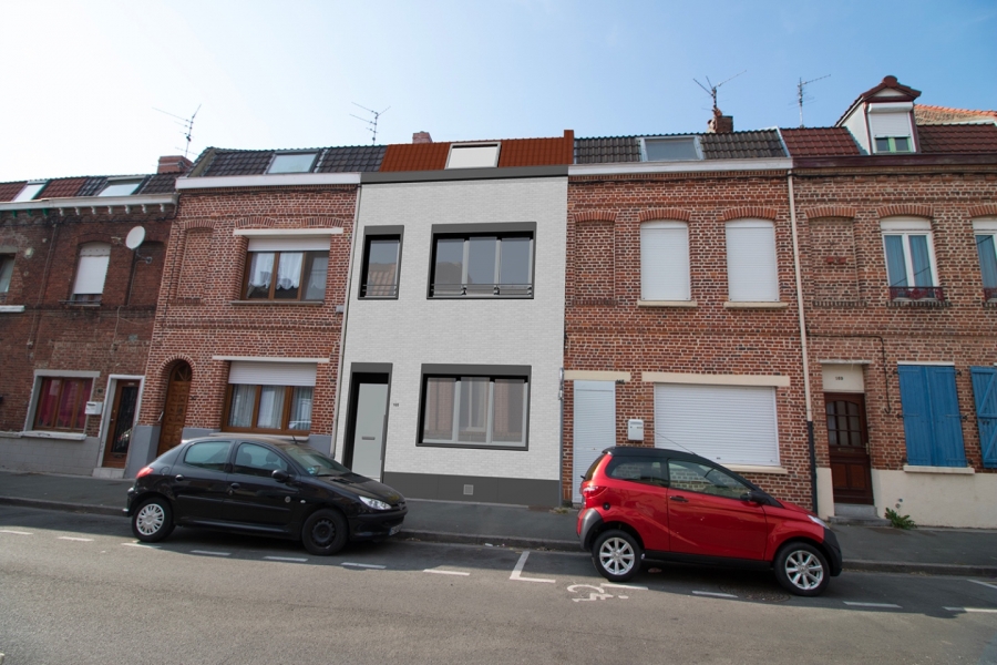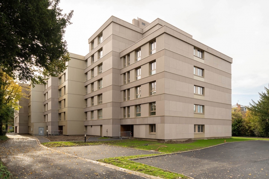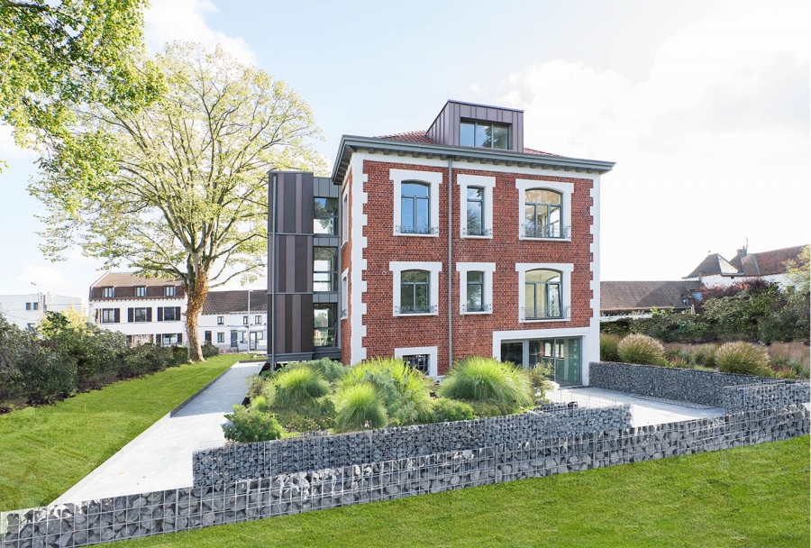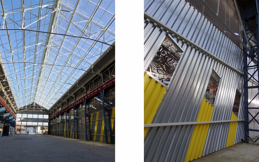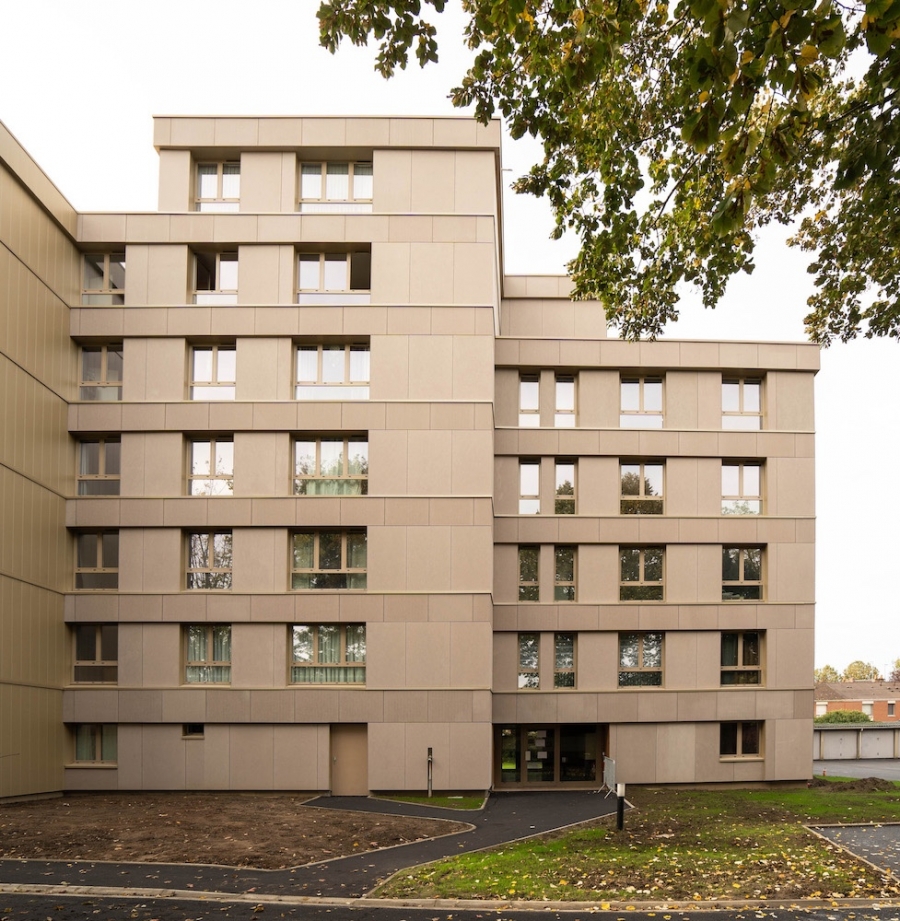 L’enveloppe du complexe sportif est isolée par l’extérieur sur l’extension et les vestiaires et par l’intérieur lorsque la brique existante veut être gardée apparente, à l’image du pignon principal. La salle René Werquin fait ainsi « peau neuve » en se parant d’un revêtement de façade en acier de couleur rose cuivré, une teinte complémentaire aux nuances de jaune de la brique existante. Le bardage de l’extension, celui de l’ITE des vestiaires et les brise-soleil de la salle se déclineront en tôle acier parfois pleine, parfois perforée, jouant avec les rythmes des pliages pour animer les façades du complexe sportif.