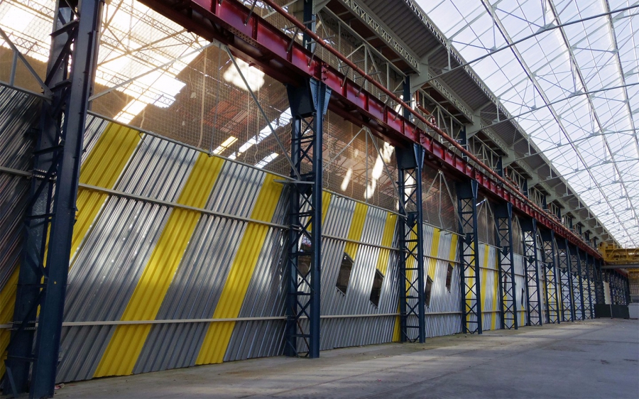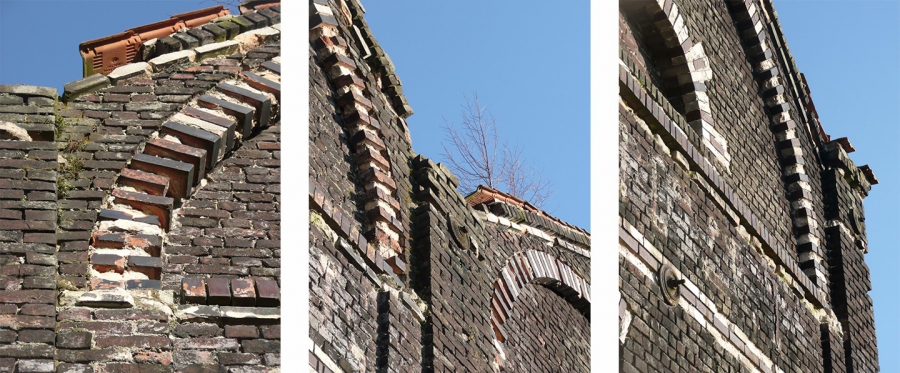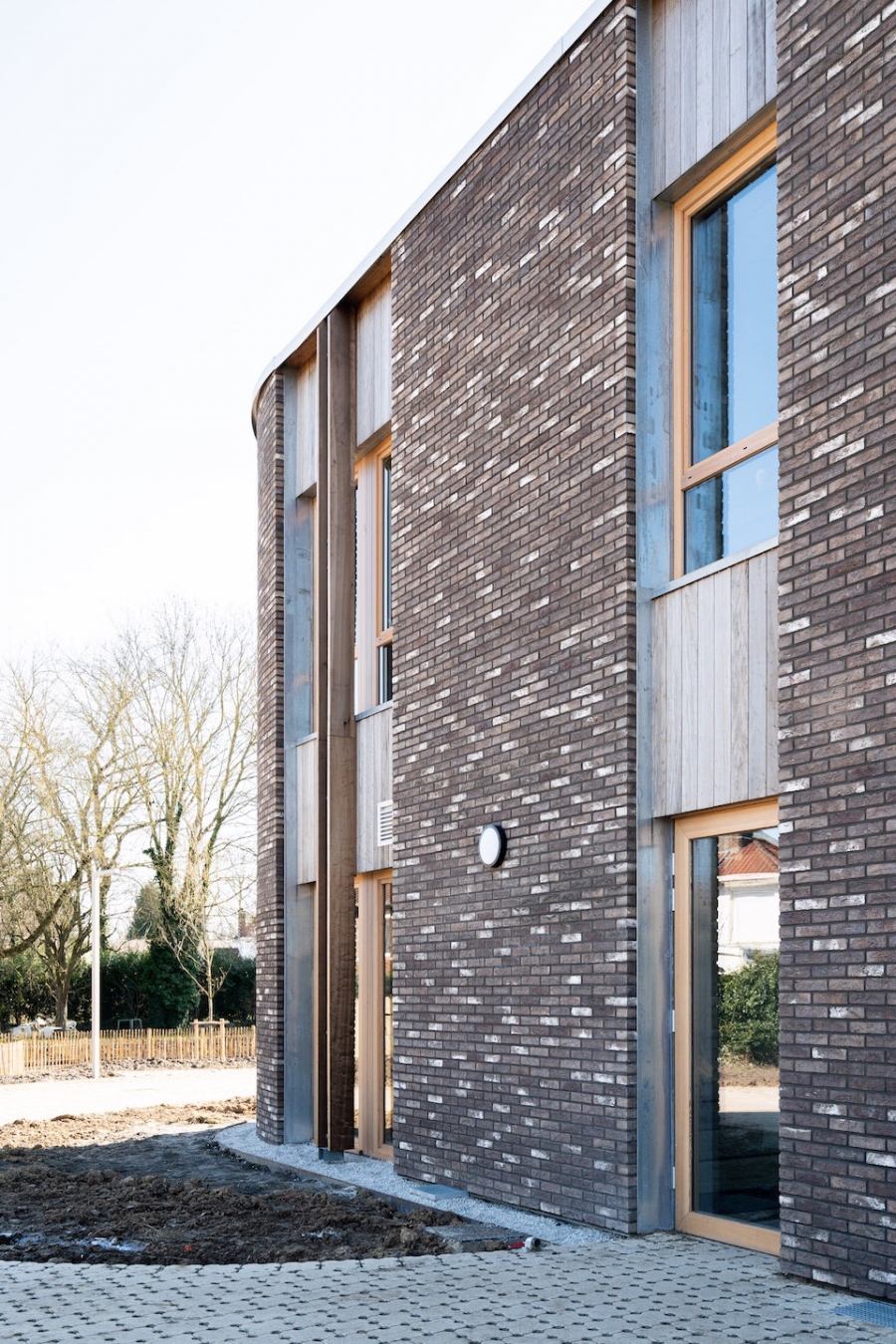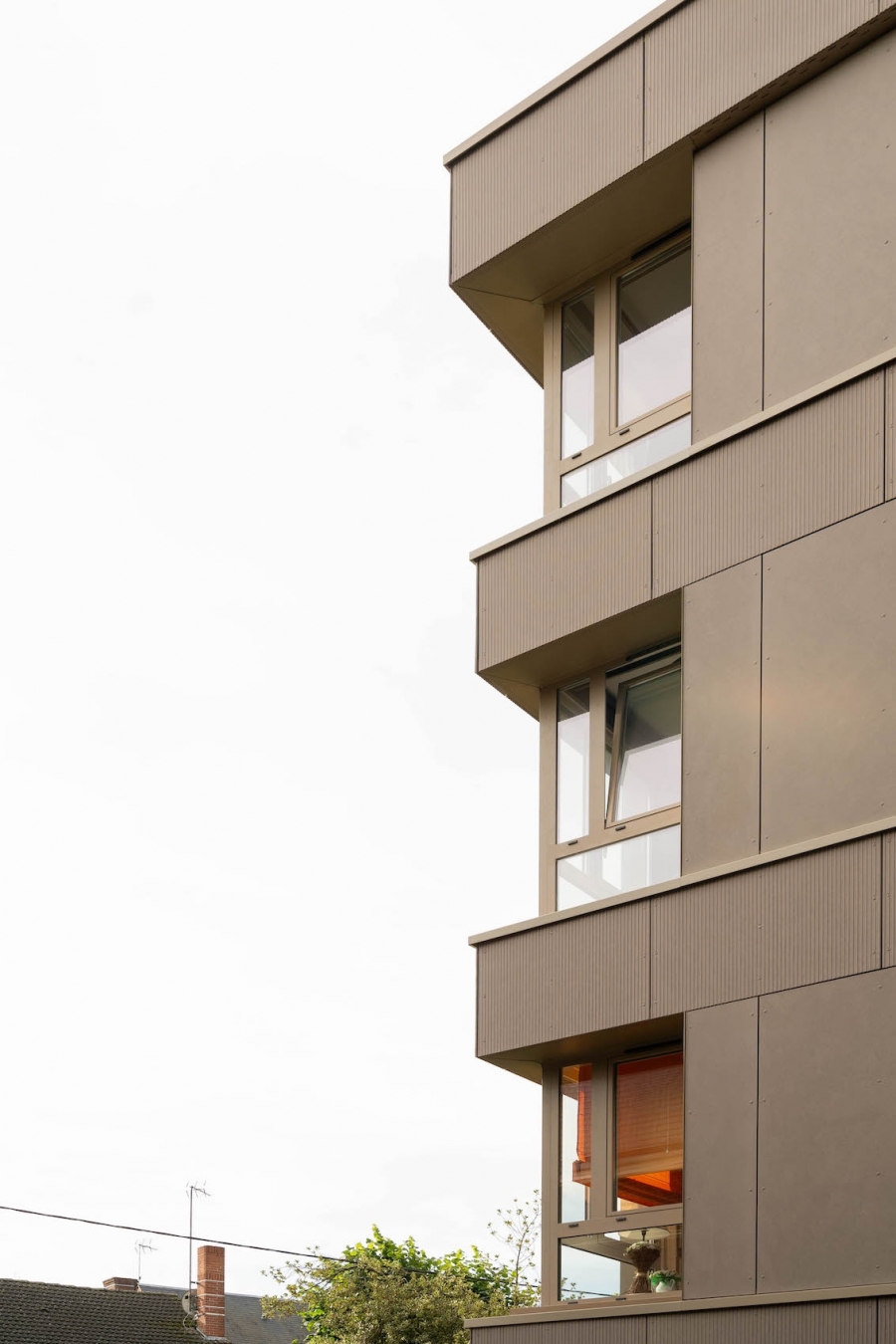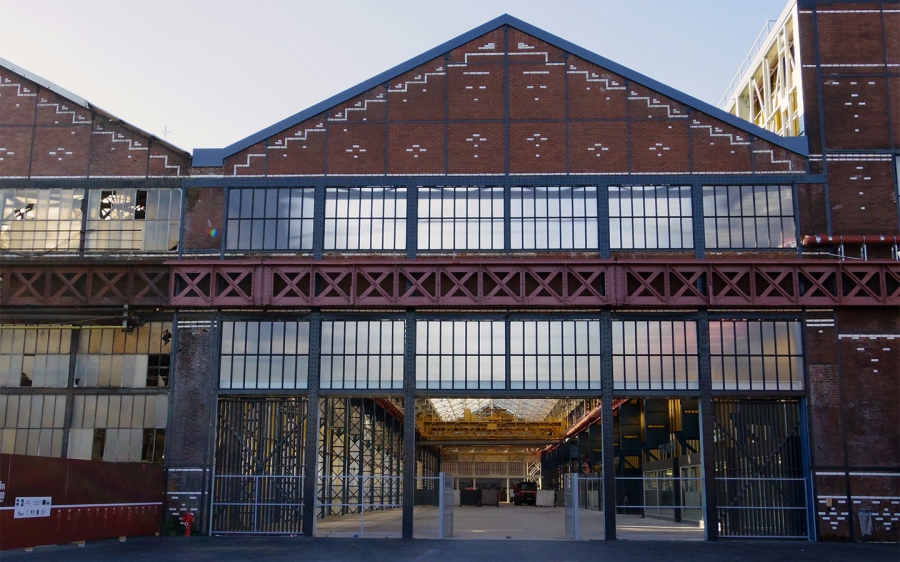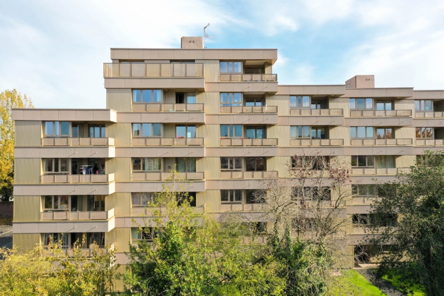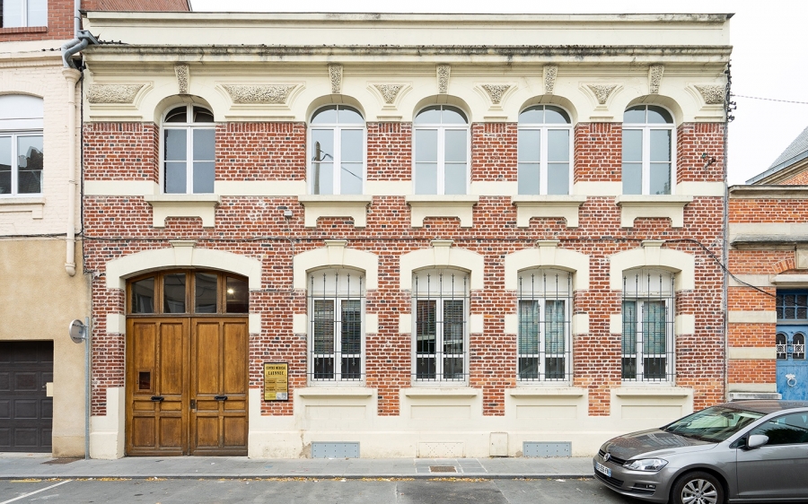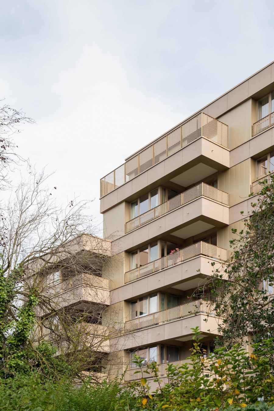 L’enveloppe du complexe sportif est isolée par l’extérieur sur l’extension et les vestiaires et par l’intérieur lorsque la brique existante veut être gardée apparente, à l’image du pignon principal. La salle René Werquin fait ainsi « peau neuve » en se parant d’un revêtement de façade en acier de couleur rose cuivré, une teinte complémentaire aux nuances de jaune de la brique existante. Le bardage de l’extension, celui de l’ITE des vestiaires et les brise-soleil de la salle se déclineront en tôle acier parfois pleine, parfois perforée, jouant avec les rythmes des pliages pour animer les façades du complexe sportif.