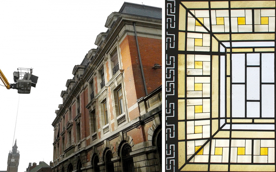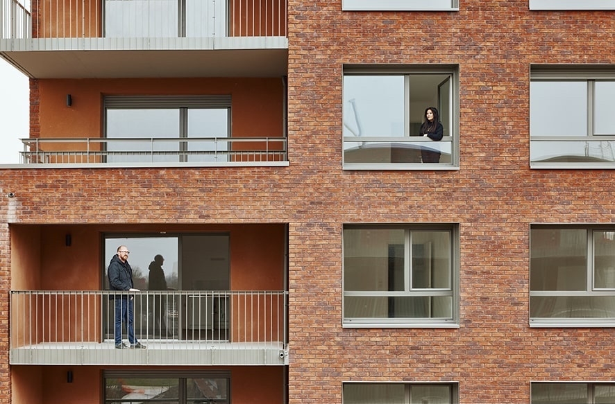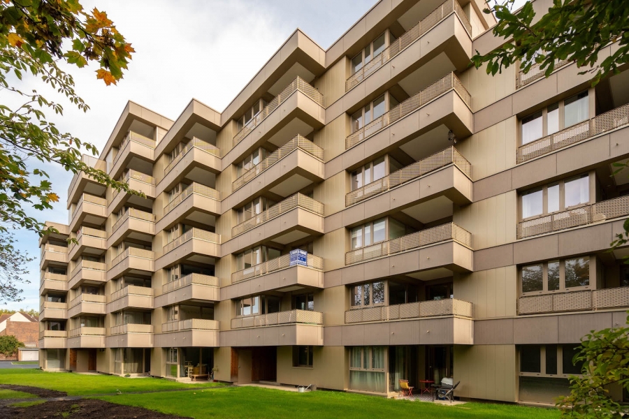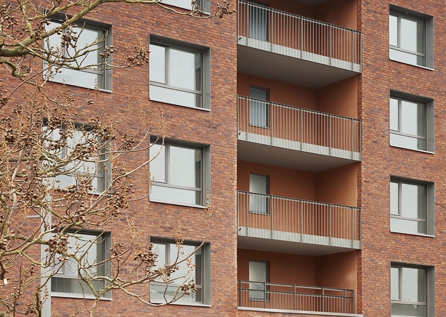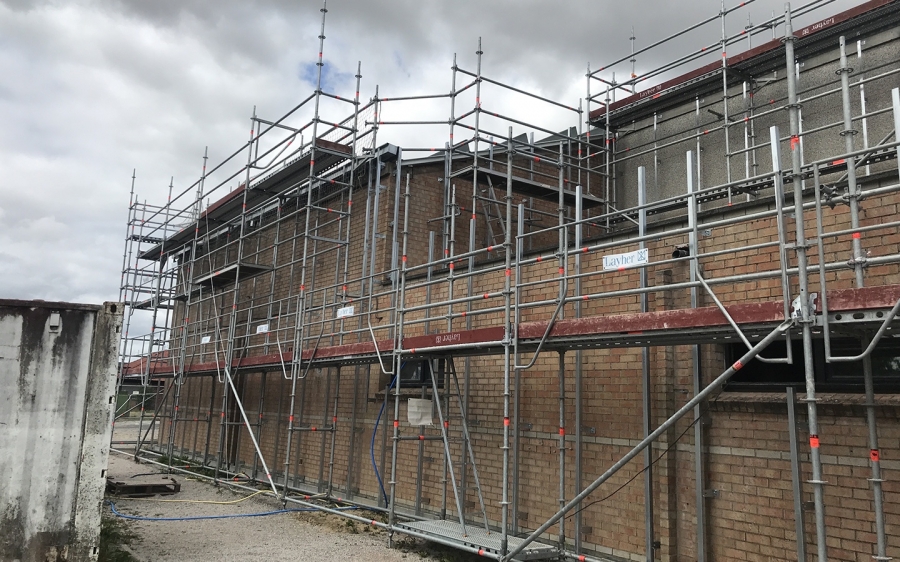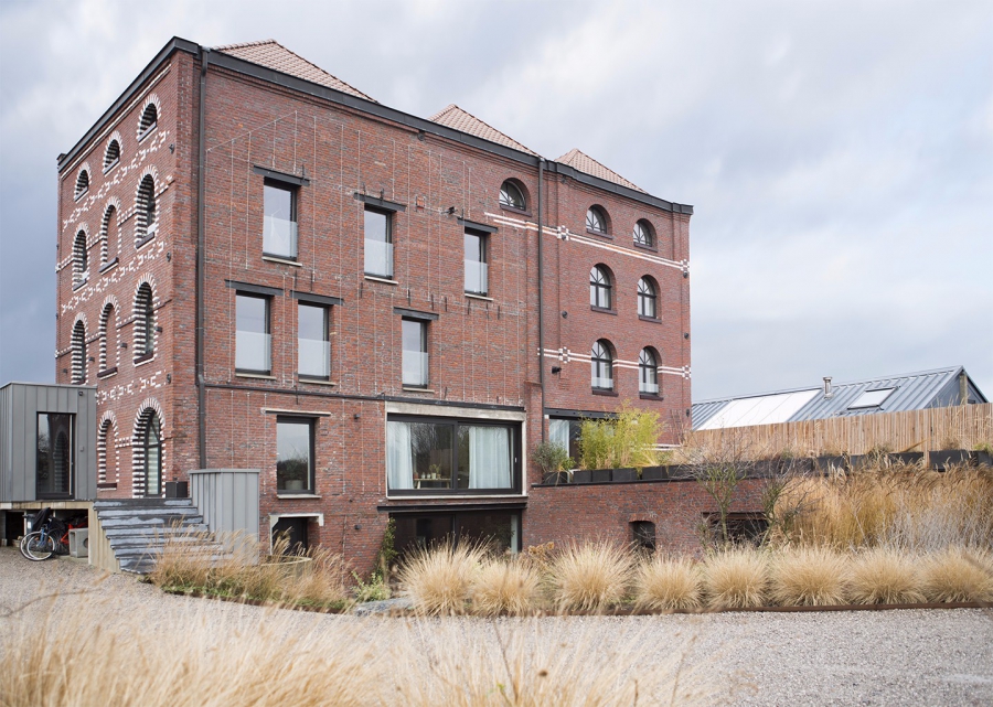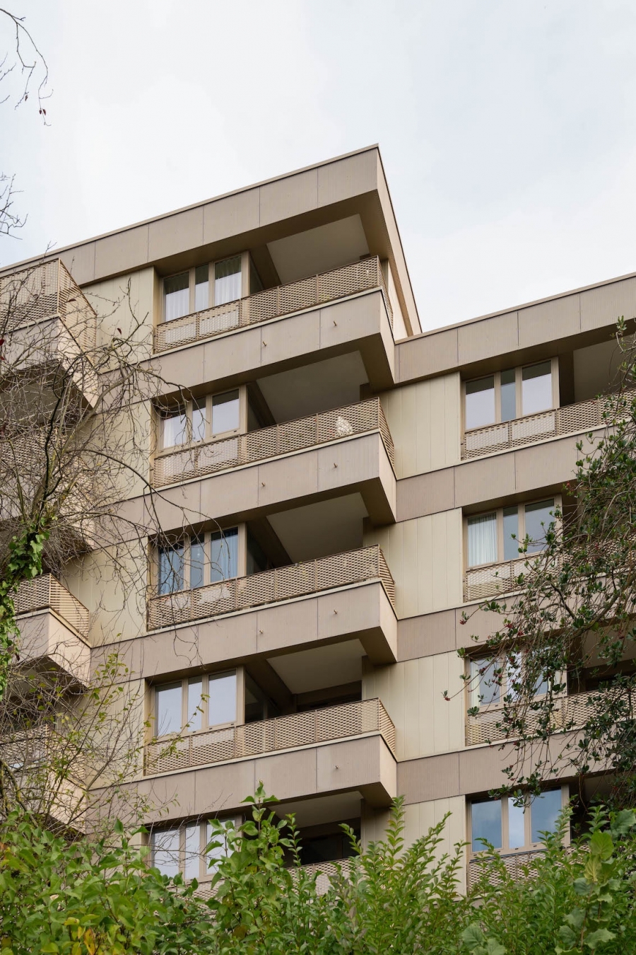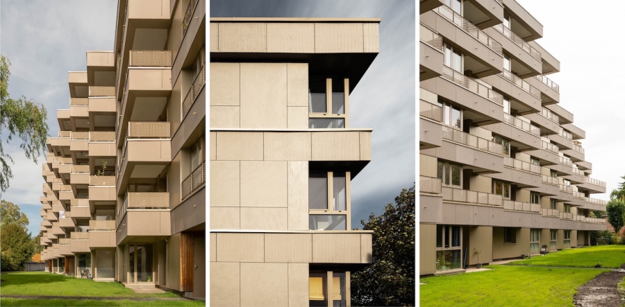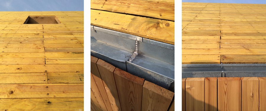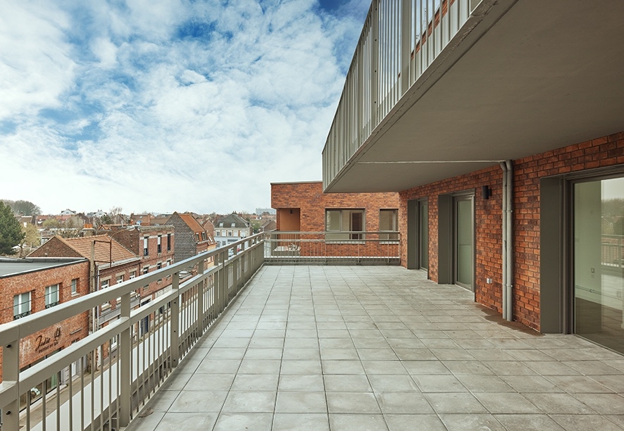 L’enveloppe du complexe sportif est isolée par l’extérieur sur l’extension et les vestiaires et par l’intérieur lorsque la brique existante veut être gardée apparente, à l’image du pignon principal. La salle René Werquin fait ainsi « peau neuve » en se parant d’un revêtement de façade en acier de couleur rose cuivré, une teinte complémentaire aux nuances de jaune de la brique existante. Le bardage de l’extension, celui de l’ITE des vestiaires et les brise-soleil de la salle se déclineront en tôle acier parfois pleine, parfois perforée, jouant avec les rythmes des pliages pour animer les façades du complexe sportif.