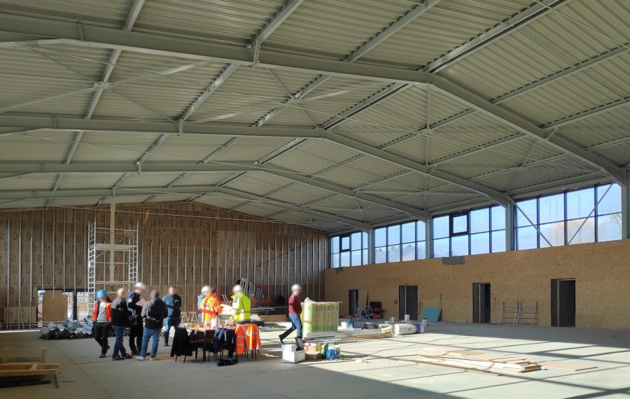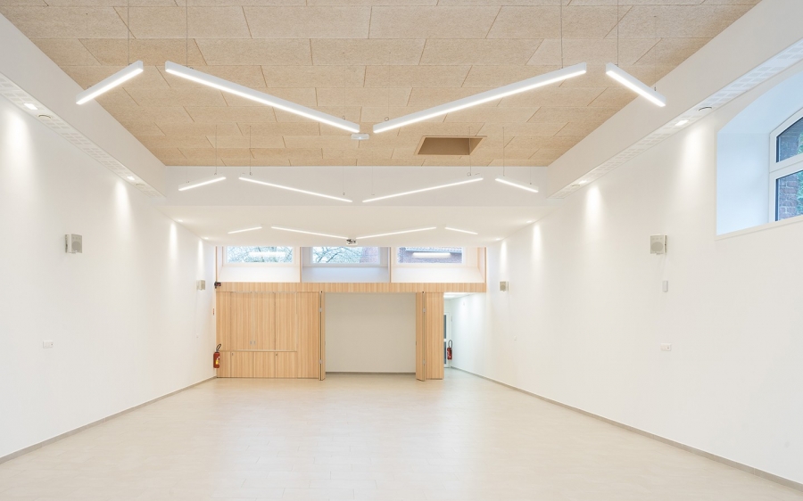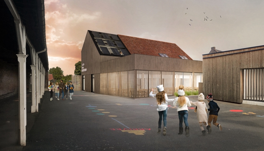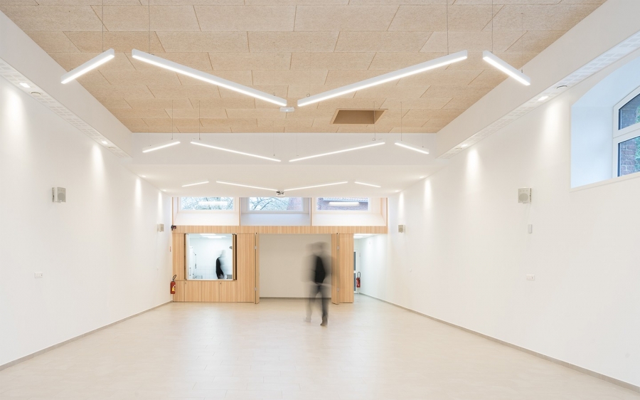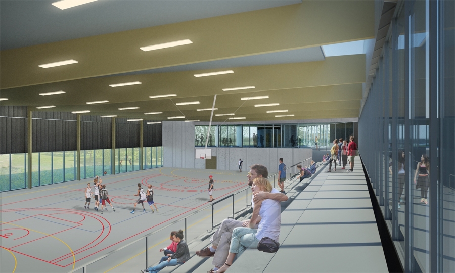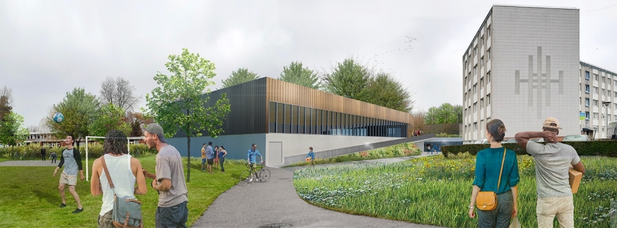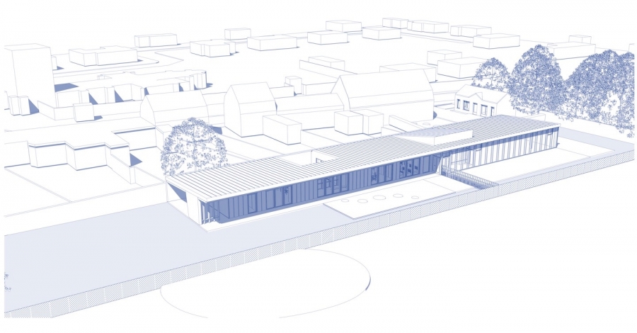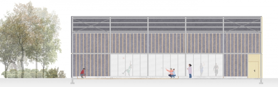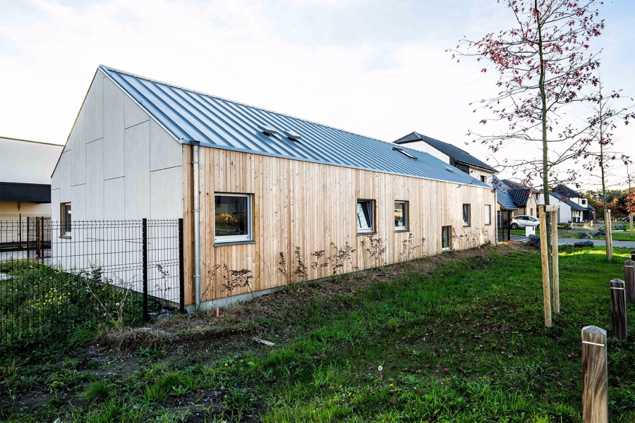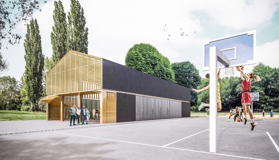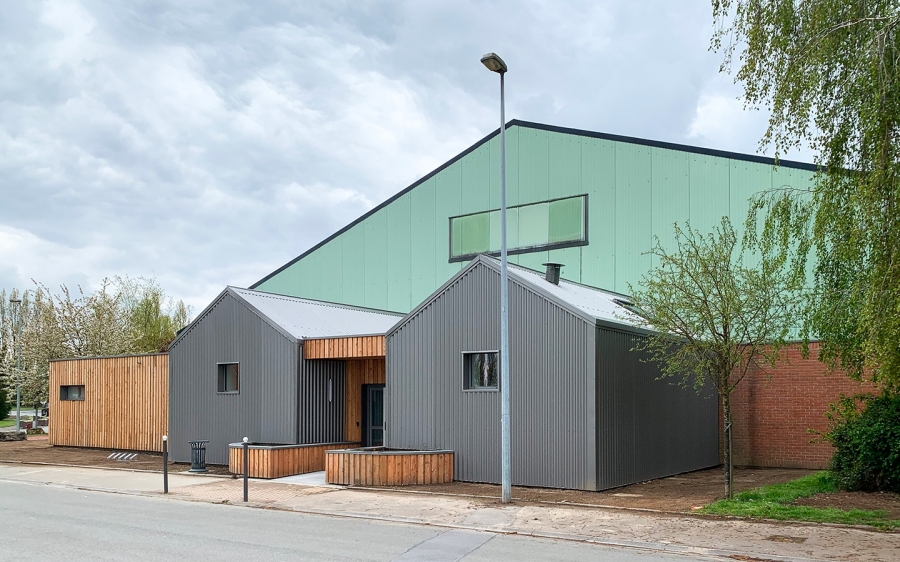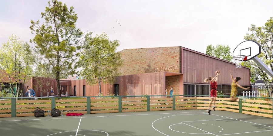 Le projet de rénovation de la salle de sports René Werquin et des vestiaires du CCA Jacques Houssin vise à améliorer les conditions d’accessibilité et de confort tout en réduisant les consommations énergétiques de ce bâtiment construit dans les années 1970. La réhabilitation thermique de la salle passe par l’installation d’une nouvelle chaudière pellets bois comme source d’énergie principale pour l’ensemble des bâtiments publics de la parcelle (salle de sport, mairie, club de foot, centre associatif et école). Profitant de l’extension accueillant la chaufferie du site, PLATO propose une nouvelle entrée "événement" visible depuis la place principale de la commune, donnant une nouvelle identité à la salle et transformant son pignon en façade principale. Parallèlement, la mise en accessibilité des vestiaires est couplée avec la requalification de l’entrée des sportifs et des espaces extérieurs y menant.