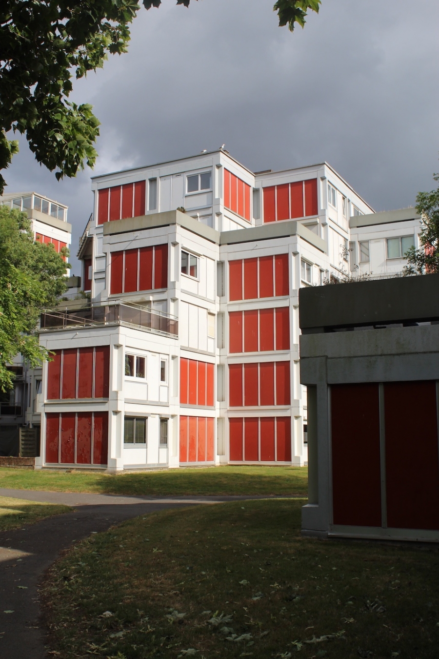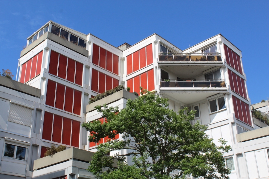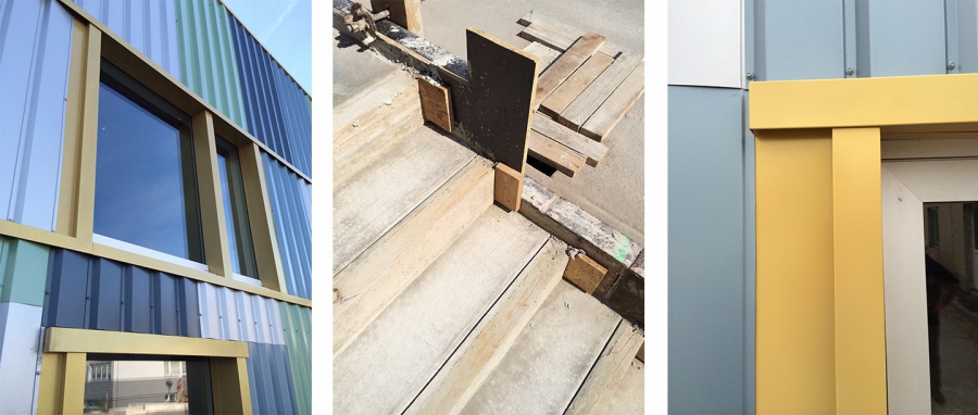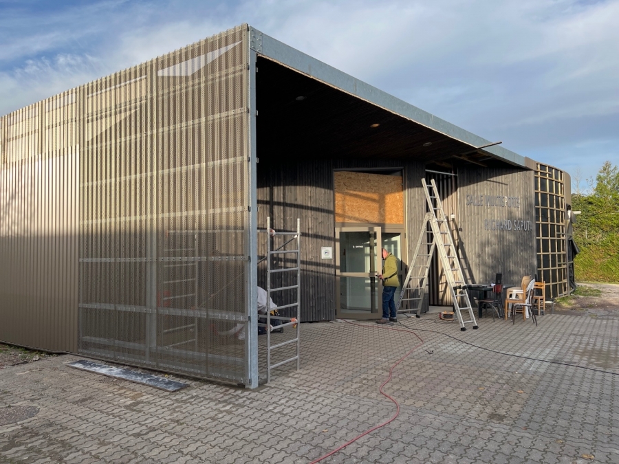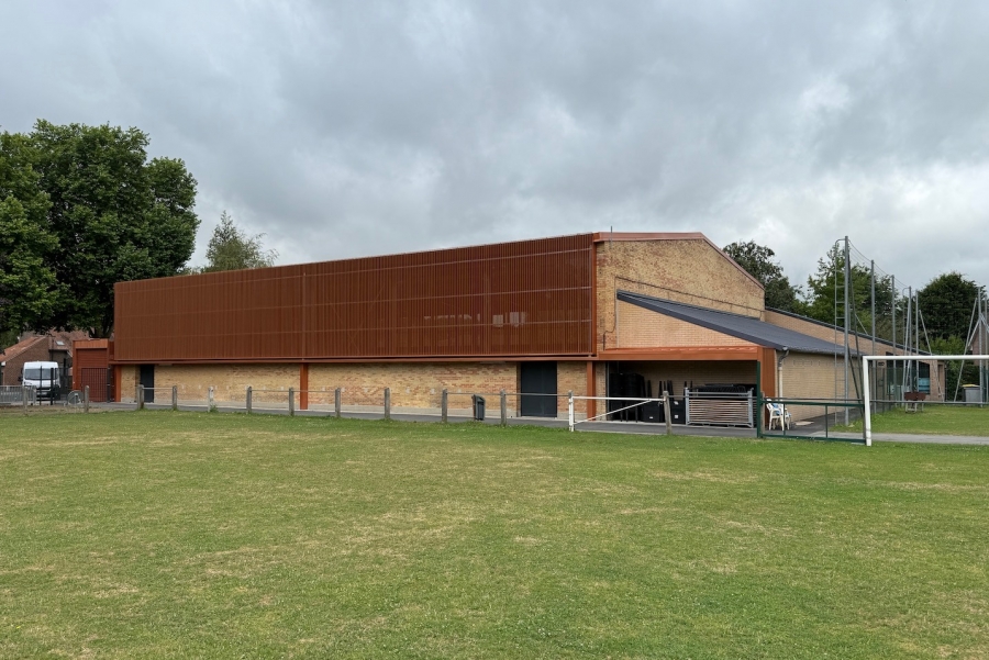 L’enveloppe du complexe sportif est isolée par l’extérieur sur l’extension et les vestiaires et par l’intérieur lorsque la brique existante veut être gardée apparente, à l’image du pignon principal. La salle René Werquin fait ainsi « peau neuve » en se parant d’un revêtement de façade en acier de couleur rose cuivré, une teinte complémentaire aux nuances de jaune de la brique existante. Le bardage de l’extension, celui de l’ITE des vestiaires et les brise-soleil de la salle se déclineront en tôle acier parfois pleine, parfois perforée, jouant avec les rythmes des pliages pour animer les façades du complexe sportif.